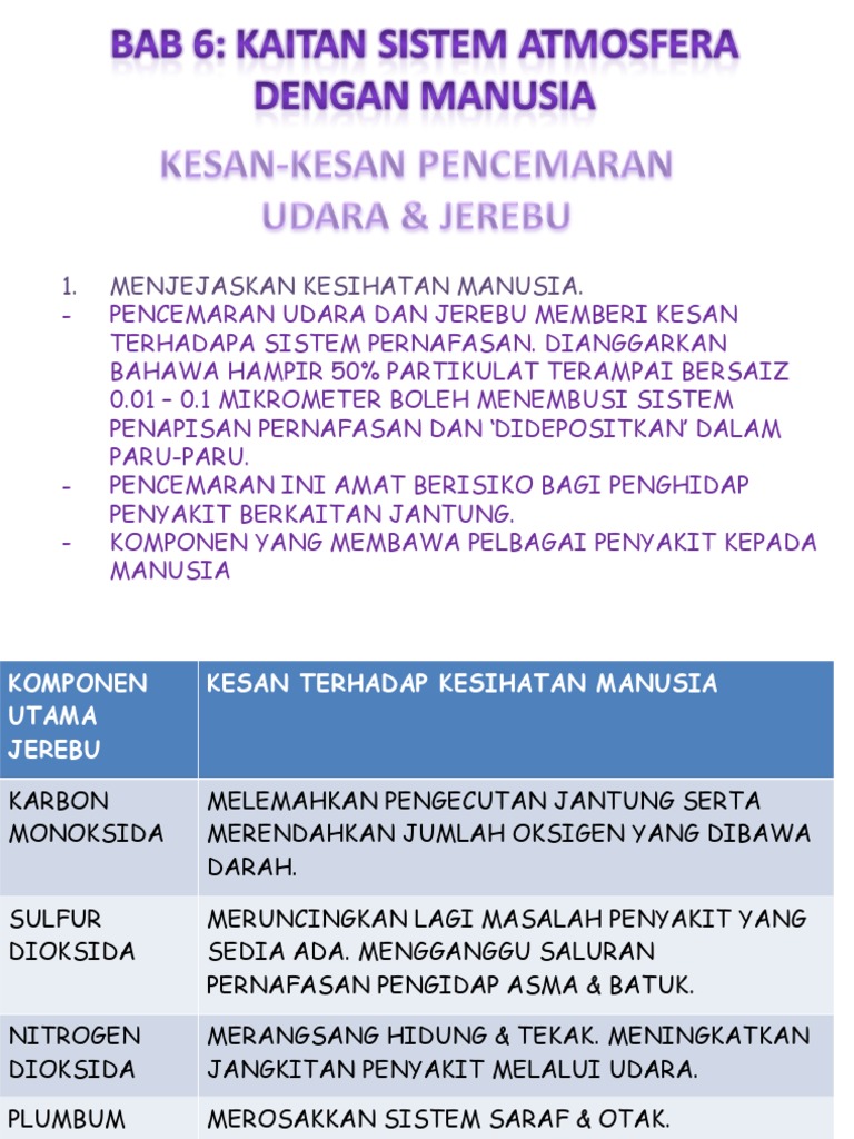 Dalam satu kajian sewaktu musim jerebu di kuala lumpur dan selangor, kemasukan pesakit meningkat sebanyak 30% disebabkan masalah kesihatan berkaitan. Satu kajian yang dijalankan oleh nasir et al. (2016) berjaya melaksanakan penilaian risiko kesihatan terhadap kesan aerosol pm 2.5 yang dikesan di kawasan pinggir bandar. Geo tingkatan 1 kesan kegiatan manusia terhadap iklim dan cuaca. Fenomena jerebu yang melanda negara kita telah mendatangkan pelbagai kesan buruk.