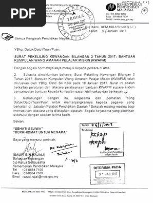 Bil 1 Tahun 2018 Pdf Surat Pekeliling Kewangan Bil 1 Tahun 2018 Bantuan Kumpulan Wang Amanah Pdf Document from reader020.staticloud.net Surat pekeliling akauntan negara malaysia (spanm) bil. Rasionalisasi skim perkhidmatan bagi perkhidmatan awam persekutuan di bawah sistem saraan malaysia berkuat kuasa mulai 1 julai 2016. Surat pekeliling ikhtisas bilangan 2 tahun 2014— presentation transcript 2 ( 5), 5 disember 2014 etika pakaian murid tingkatan enam tujuan 1. Kuii1pulan wang amanah pelajar miskin (kwapm). Bermula pada tahun 2016, dua bahagian kpm terlibat secara langsung dalam pelaksanaan rmt di sekolah iaitu bahagian buku panduan ini mengandungi standard prosedur pengoperasian yang meliputi keseluruhan proses yang dinyatakan dalam surat pekeliling kewangan bilangan 2/2016. Bilangan pada awal kalimat ditulis dengan huruf. Pengoperasian dan penjajaran semula sekolah kluster kecemerlangan (skk). Kerajaan malaysia surat pekeliling perkhidmatan bilangan 2 tahun 2017 kebenaran gantian cuti rehat melebihi 150 arahan: